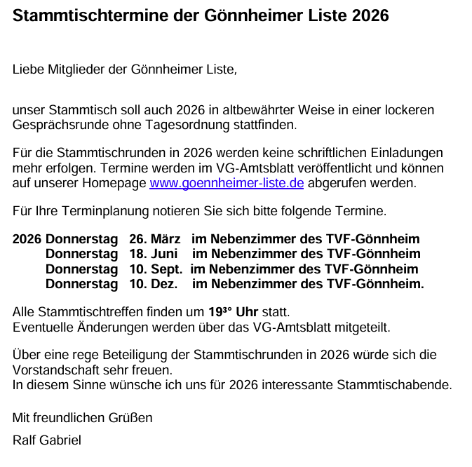 Liebe Mitglieder der Gönnheimer Liste,